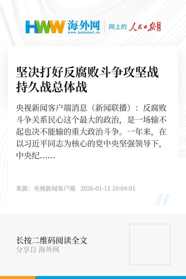 央视新闻客户端消息(新闻联播):反腐败斗争关系民心这个最大的政治,是一场输不起也决不能输的重大政治斗争。一年来,在以习近平同志为核心的党中央坚强领导下,中央纪委国家监委和各级纪检监察机关始终保持战略定力和高压态势,一步不停歇、半步不退让,以永远在路上的坚韧执着把反腐败斗争向纵深推进。