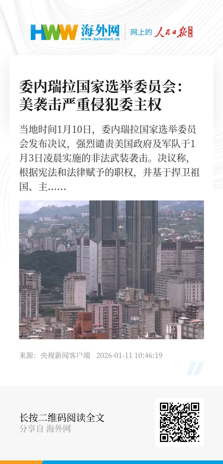 当地时间1月10日,委内瑞拉国家选举委员会发布决议,强烈谴责美国政府及军队于1月3日凌晨实施的非法武装袭击。
