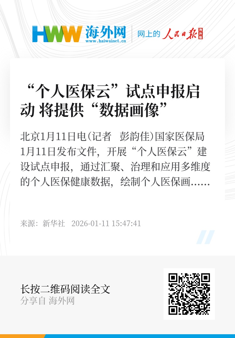 新华社北京1月11日电(记者 彭韵佳)国家医保局1月11日发布文件,开展“个人医保云”建设试点申报,通过汇聚、治理和应用多维度的个人医保健康数据,绘制个人医保画像,探索构建覆盖全人群、全周期、全场景的智慧医保管理新范式。