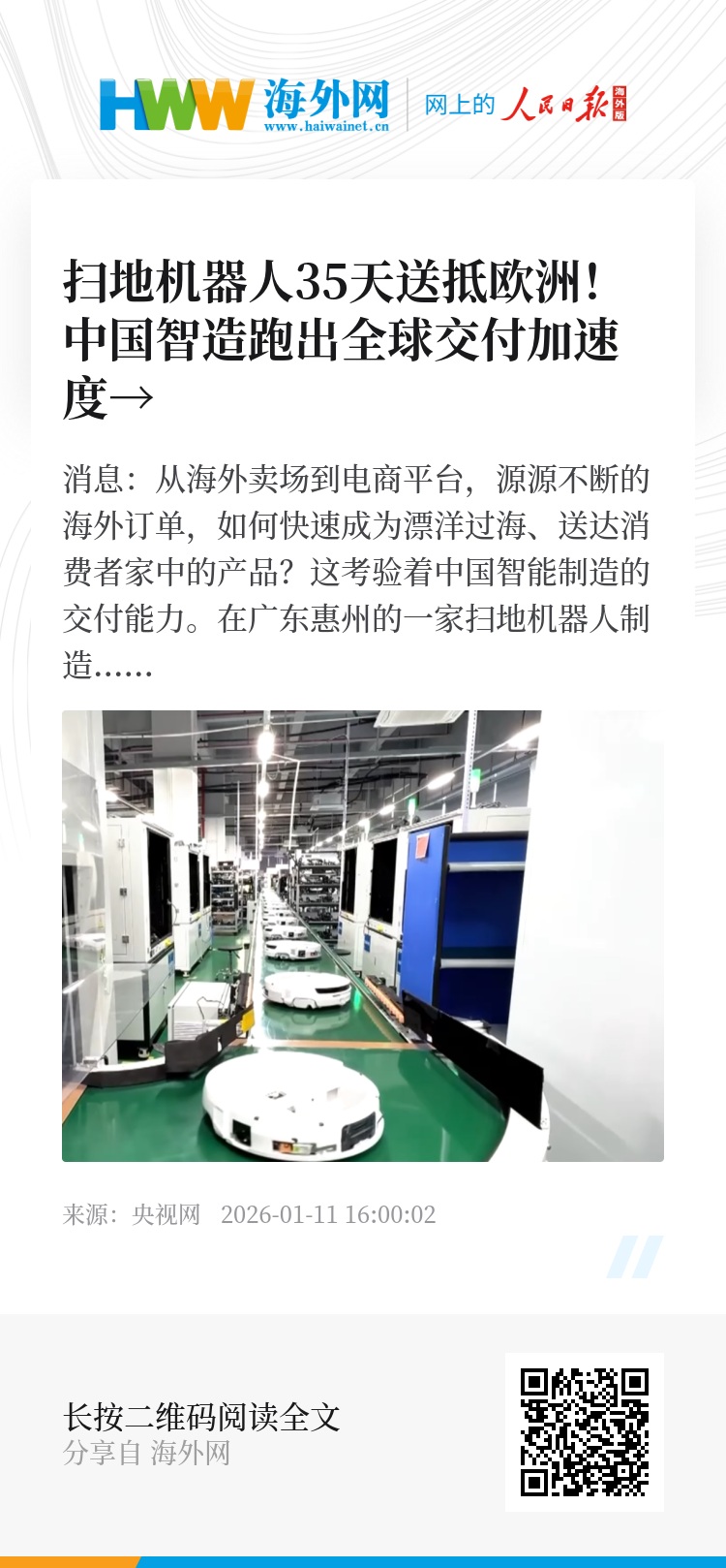 总台央视记者 宋华:火热的全球订单,正在转化为中国工厂里轰鸣的生产线。我现在来到的这条产线,生产的是北美和欧洲地区最受欢迎的一款机型,它的底盘升降和强吸力功能,能轻松应对不同地面的清洁难题,尤其擅长地毯的深度清理。目前这款机器的订单已经排到了2026年的4月。据了解,该工厂整机的最高月产能可达20万台,六成以上都是海外订单。