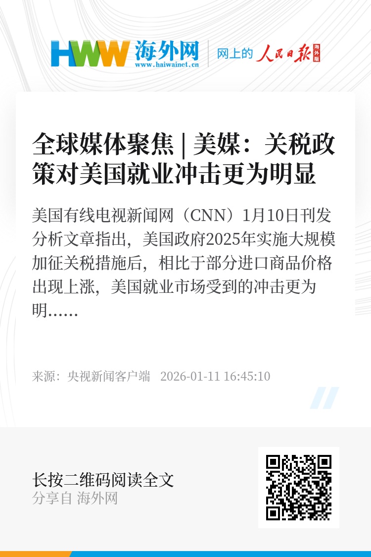 美国有线电视新闻网(CNN)1月10日刊发分析文章指出,美国政府2025年实施大规模加征关税措施后,相比于部分进口商品价格出现上涨,美国就业市场受到的冲击更为明显。