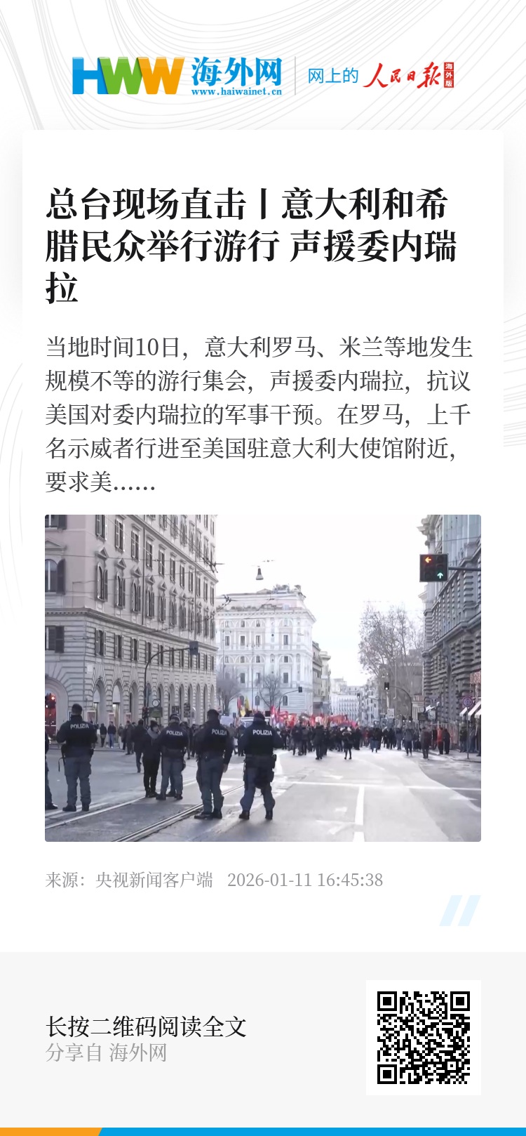 总台记者 殷欣:游行队伍从罗马市中心的一处广场出发,一直朝着美国驻意大利大使馆方向行进。在我身后,道路的尽头,就是美国驻意大利大使馆。现场可以看到,由于警方封锁了大使馆附近的道路,游行队伍并不能靠近大使馆。尽管如此,现场的示威者依旧对美国向委内瑞拉发动袭击表示了强烈谴责。