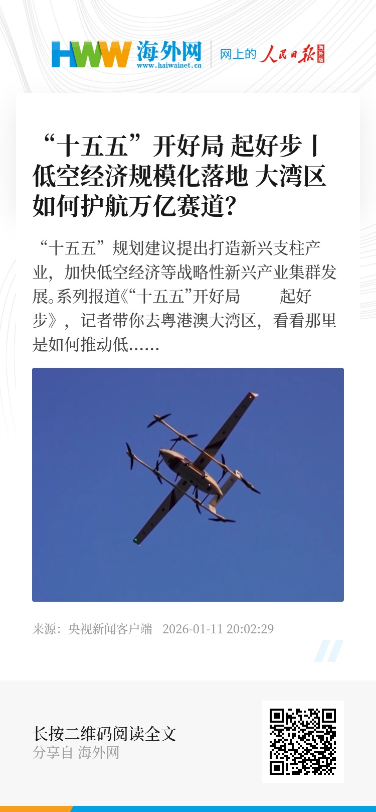 “十五五”规划建议提出打造新兴支柱产业,加快低空经济等战略性新兴产业集群发展。系列报道《“十五五”开好局 起好步》,记者带你去粤港澳大湾区,看看那里是如何推动低空经济从场景试点走向规模化落地的。