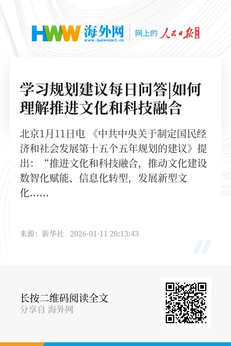 新华社北京1月11日电 《中共中央关于制定国民经济和社会发展第十五个五年规划的建议》提出:“推进文化和科技融合,推动文化建设数智化赋能、信息化转型,发展新型文化业态。”这是在新一轮科技革命和产业变革加速突破的形势下,推动文化高质量发展、建设社会主义文化强国的重要举措。