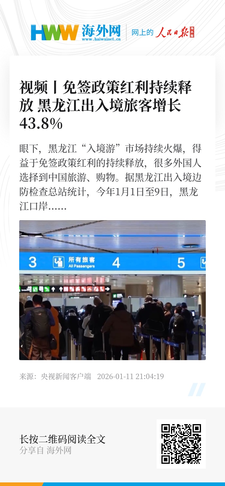 据黑龙江出入境边防检查总站统计,今年1月1日至9日,黑龙江口岸出入境游客9.1万余人次,较去年同期增长43.8%,“入境游”迎来开门红。