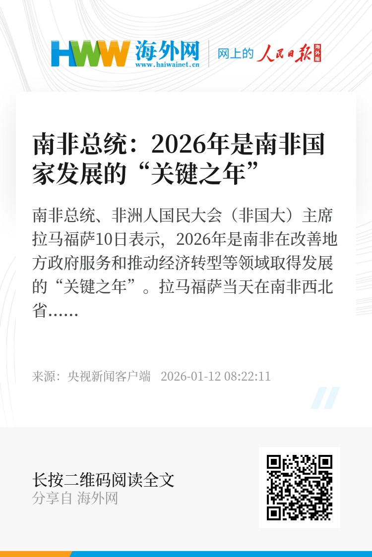 南非总统、非洲人国民大会(非国大)主席拉马福萨10日表示,2026年是南非在改善地方政府服务和推动经济转型等领域取得发展的“关键之年”。