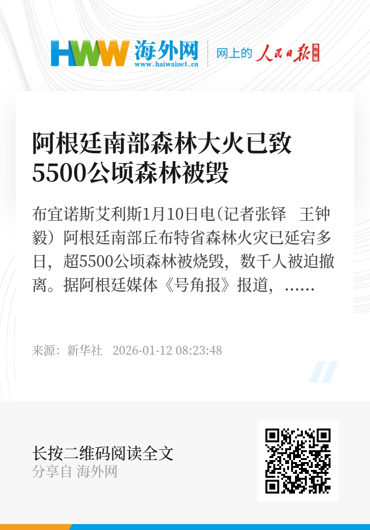 新华社布宜诺斯艾利斯1月10日电(记者张铎 王钟毅)阿根廷南部丘布特省森林火灾已延宕多日,超5500公顷森林被烧毁,数千人被迫撤离。