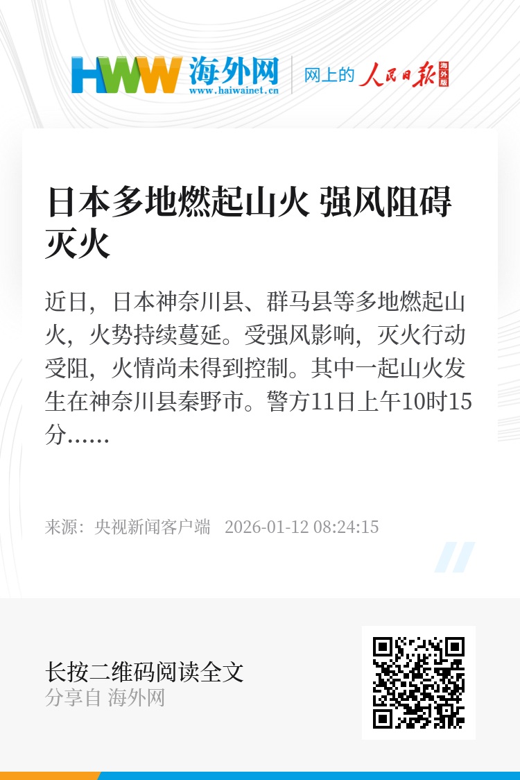 近日,日本神奈川县、群马县等多地燃起山火,火势持续蔓延。受强风影响,灭火行动受阻,火情尚未得到控制。