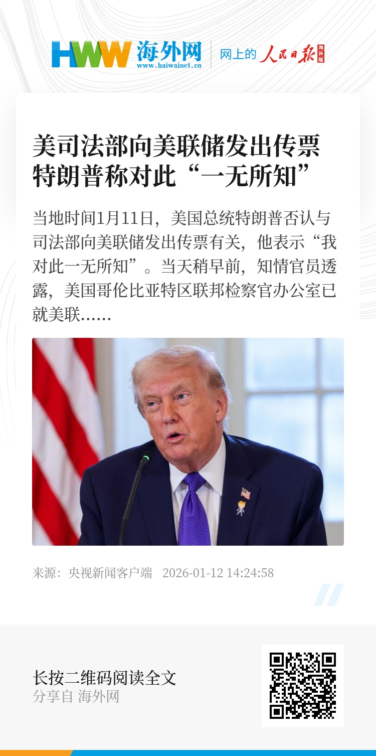 当地时间1月11日,美国总统特朗普否认与司法部向美联储发出传票有关,他表示“我对此一无所知”。