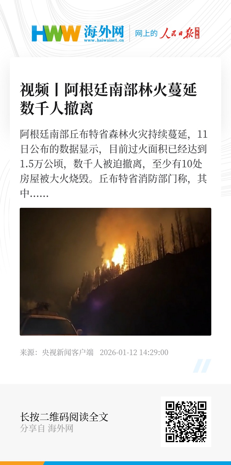 阿根廷南部丘布特省森林火灾持续蔓延,11日公布的数据显示,目前过火面积已经达到1.5万公顷,数千人被迫撤离,至少有10处房屋被大火烧毁。丘布特省消防部门称,其中最大一处位于安第斯山脉附近的林火,过火面积达到约1.2万公顷。不过10日部分地区迎来降雨暂缓火情。丘布特省政府表示,近500名消防员及救援人员正在参与灭火行动。阿根廷国家安全部表示,初步调查结果显示,此次火灾可能是纵火所致。