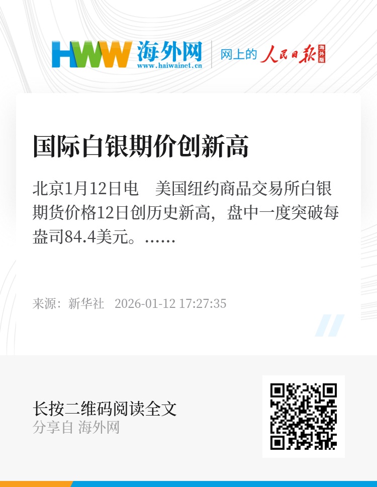 新华社北京1月12日电 美国纽约商品交易所白银期货价格12日创历史新高,盘中一度突破每盎司84.4美元。
