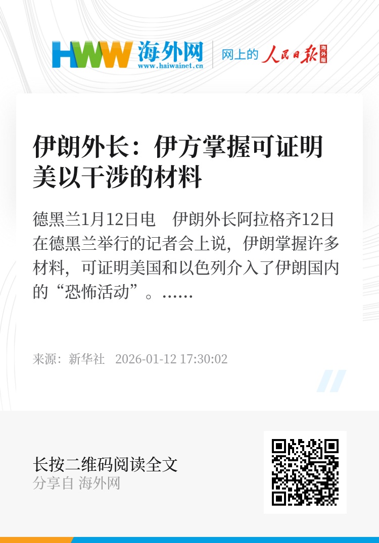 新华社德黑兰1月12日电 伊朗外长阿拉格齐12日在德黑兰举行的记者会上说,伊朗掌握许多材料,可证明美国和以色列介入了伊朗国内的“恐怖活动”。