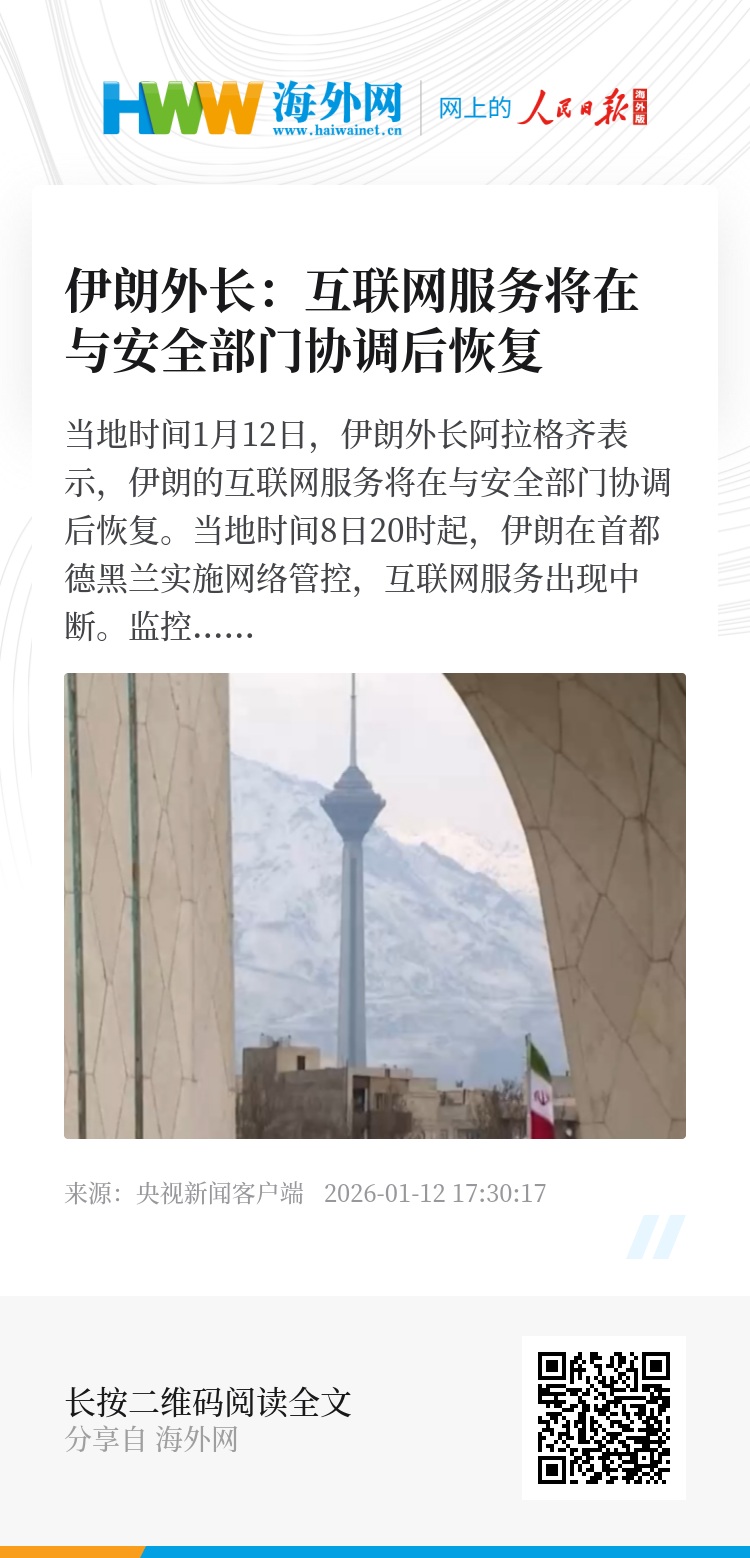 当地时间1月12日,伊朗外长阿拉格齐表示,伊朗的互联网服务将在与安全部门协调后恢复。