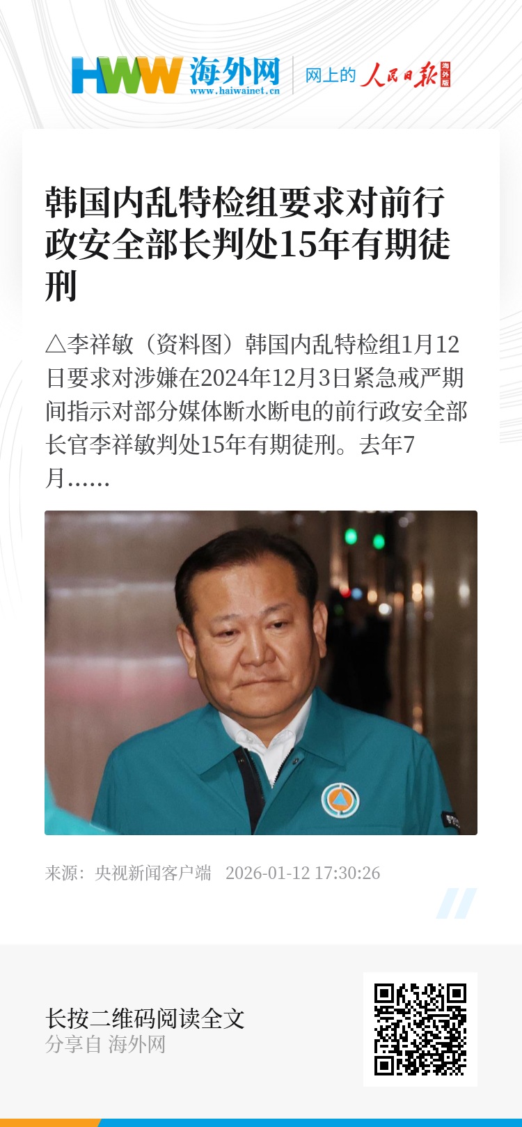韩国内乱特检组1月12日要求对涉嫌在2024年12月3日紧急戒严期间指示对部分媒体断水断电的前行政安全部长官李祥敏判处15年有期徒刑。