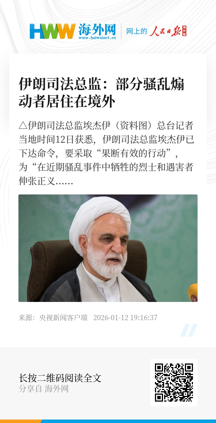 总台记者当地时间12日获悉,伊朗司法总监埃杰伊已下达命令,要采取“果断有效的行动”,为“在近期骚乱事件中牺牲的烈士和遇害者伸张正义”。