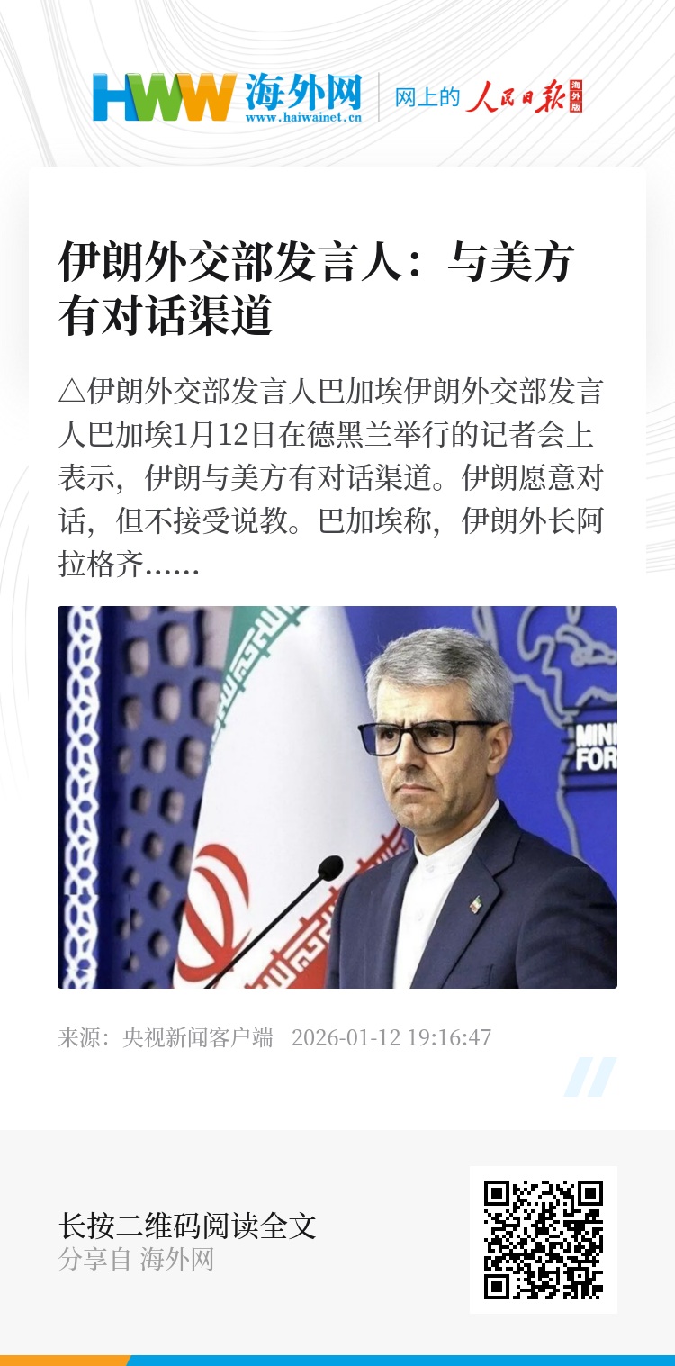伊朗外交部发言人巴加埃1月12日在德黑兰举行的记者会上表示,伊朗与美方有对话渠道。伊朗愿意对话,但不接受说教。