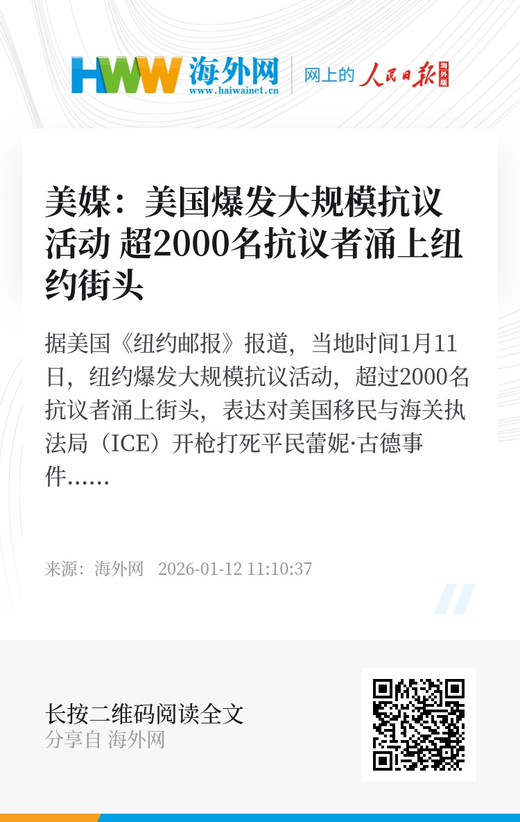 海外网1月12日电 据美国《纽约邮报》报道,当地时间1月11日,纽约爆发大规模抗议活动,超过2000名抗议者涌上街头,表达对美国移民与海关执法局(ICE)开枪打死平民蕾妮·古德事件的不满。