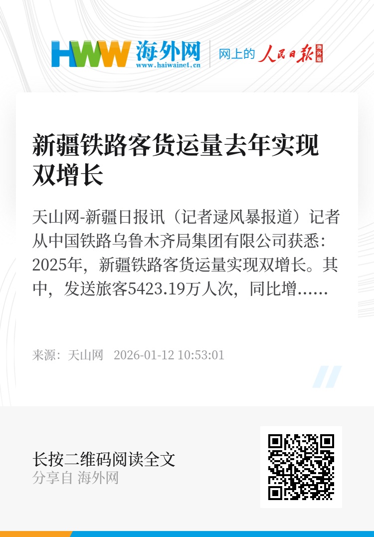 天山网-新疆日报讯(记者逯风暴报道)记者从中国铁路乌鲁木齐局集团有限公司获悉:2025年,新疆铁路客货运量实现双增长。其中,发送旅客5423.19万人次,同比增长6.8%;货运发送量2.5亿吨,同比增长5.3%。