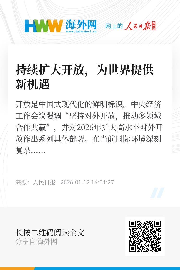 开放是中国式现代化的鲜明标识。中央经济工作会议强调“坚持对外开放,推动多领域合作共赢”,并对2026年扩大高水平对外开放作出系列具体部署。在当前国际环境深刻复杂变化的情况下,这彰显出坚持开放合作、互利共赢的大国自信和担当,宣示了以中国高质量发展为世界提供新机遇的强烈信号。