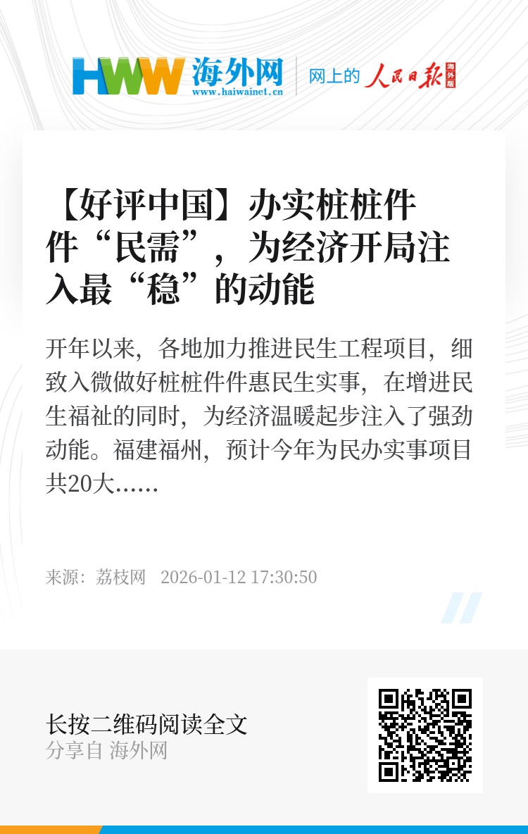 开年以来,各地加力推进民生工程项目,细致入微做好桩桩件件惠民生实事,在增进民生福祉的同时,为经济温暖起步注入了强劲动能。福建福州,预计今年为民办实事项目共20大项56件,涉及教育、公共卫生、交通便民、养老保障等多个民生领域;在辽宁东港,政府计划为65岁以上独居老人免费更换燃气管阀;在江苏,在去年45件民生实事全面高质量完成的基础上,今年继续加大民生投入力度,从老有所养、病有所医、幼有所育等方面持续用力,厚实发展“暖色调”……放眼各地,一项项民生工程的暖心变化,勾勒出民生发展的新图景,也托举起千家万户“稳稳的幸福”。