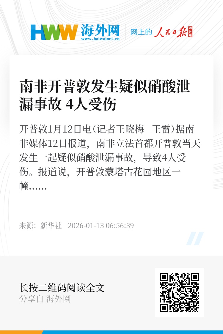 新华社开普敦1月12日电(记者王晓梅 王雷)据南非媒体12日报道,南非立法首都开普敦当天发生一起疑似硝酸泄漏事故,导致4人受伤。