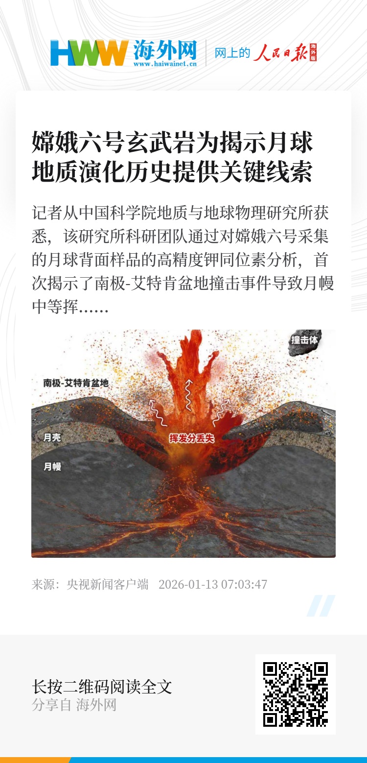 记者从中国科学院地质与地球物理研究所获悉,该研究所科研团队通过对嫦娥六号采集的月球背面样品的高精度钾同位素分析,首次揭示了南极-艾特肯盆地撞击事件导致月幔中等挥发性元素丢失,为理解大型撞击对月球演化的影响,以及揭示月球二分性的成因提供了重要依据。相关研究成果北京时间1月13日在国际学术期刊《美国国家科学院院刊》在线发表。
