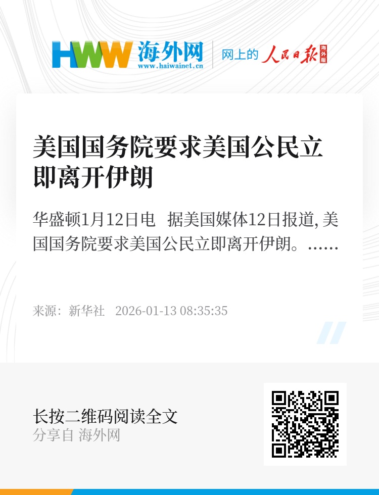 新华社华盛顿1月12日电 据美国媒体12日报道,美国国务院要求美国公民立即离开伊朗。