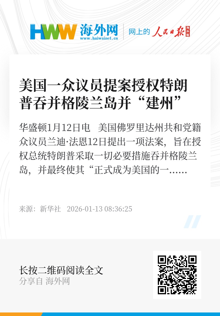 新华社华盛顿1月12日电 美国佛罗里达州共和党籍众议员兰迪·法恩12日提出一项法案,旨在授权总统特朗普采取一切必要措施吞并格陵兰岛,并最终使其“正式成为美国的一个州”。