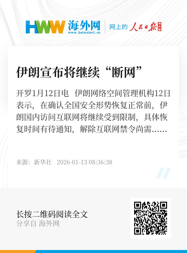 新华社开罗1月12日电 伊朗网络空间管理机构12日表示,在确认全国安全形势恢复正常前,伊朗国内访问互联网将继续受到限制,具体恢复时间有待通知,解除互联网禁令尚需进一步深思熟虑。