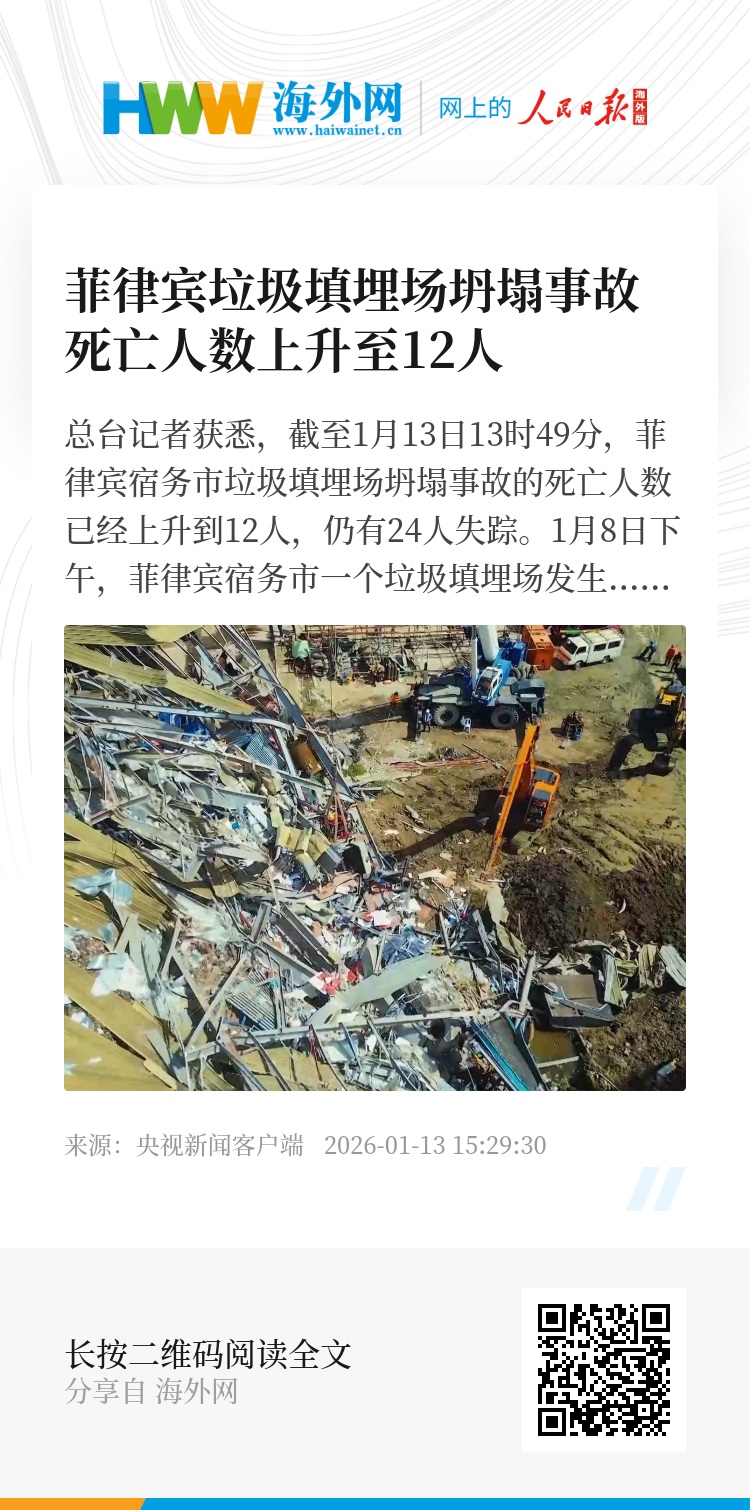 总台记者获悉,截至1月13日13时49分,菲律宾宿务市垃圾填埋场坍塌事故的死亡人数已经上升到12人,仍有24人失踪。