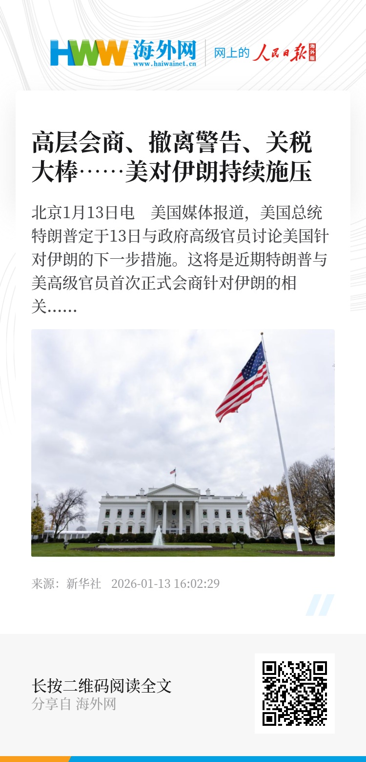 新华社北京1月13日电 美国媒体报道,美国总统特朗普定于13日与政府高级官员讨论美国针对伊朗的下一步措施。这将是近期特朗普与美高级官员首次正式会商针对伊朗的相关方案。美国国务院12日发布“安全警告”,要求美国公民立即离开伊朗。