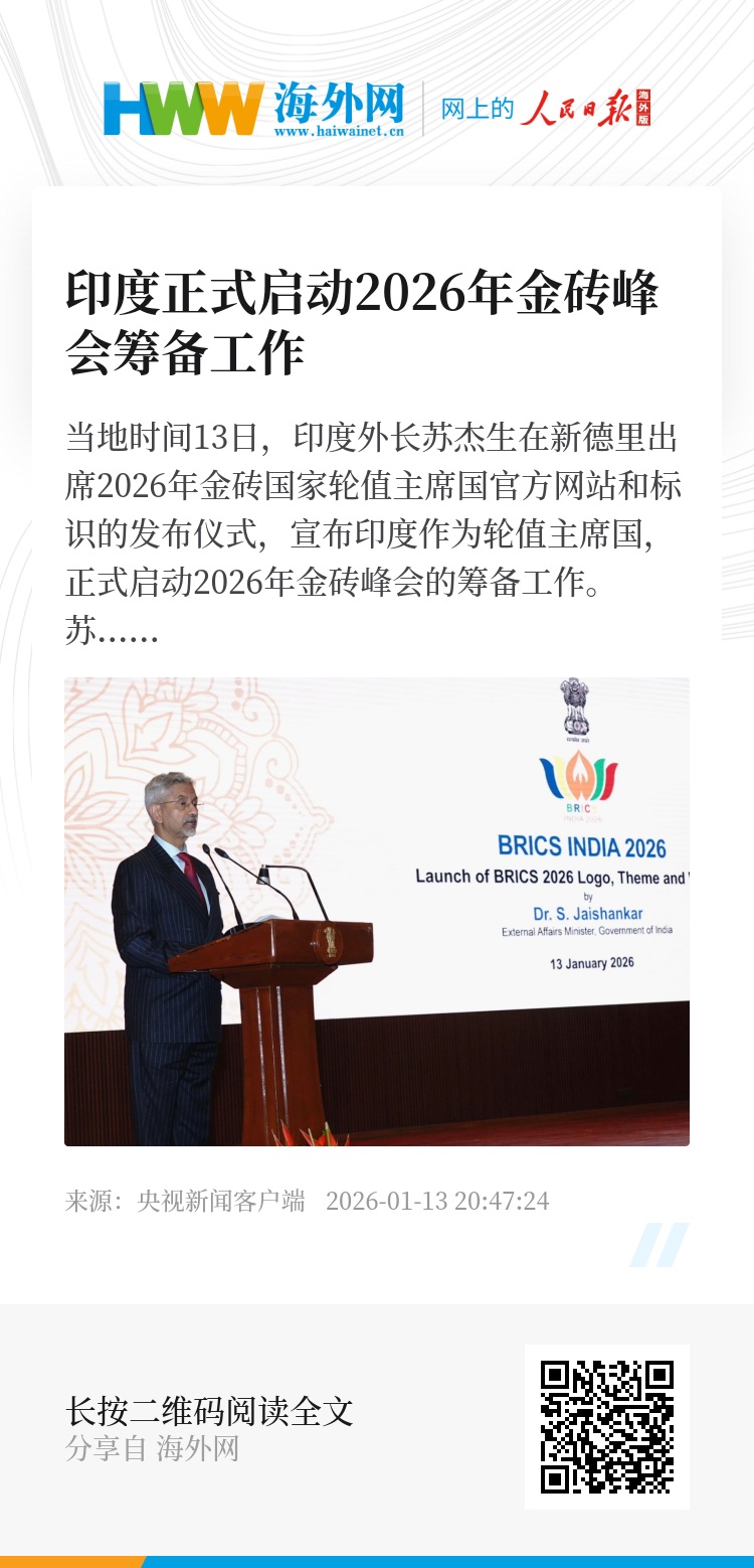 当地时间13日,印度外长苏杰生在新德里出席2026年金砖国家轮值主席国官方网站和标识的发布仪式,宣布印度作为轮值主席国,正式启动2026年金砖峰会的筹备工作。