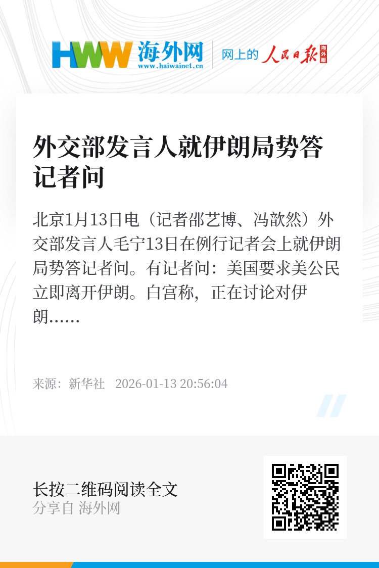 新华社北京1月13日电(记者邵艺博、冯歆然)外交部发言人毛宁13日在例行记者会上就伊朗局势答记者问。