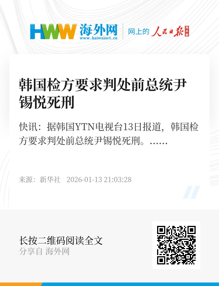 新华社快讯:据韩国YTN电视台13日报道,韩国检方要求判处前总统尹锡悦死刑。