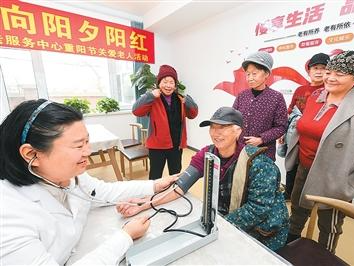 2025年10月29日,在黑龙江省哈尔滨市向阳镇的幸福养老服务中心,医务人员在帮老年人检测血压。