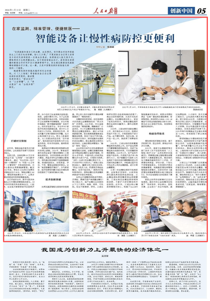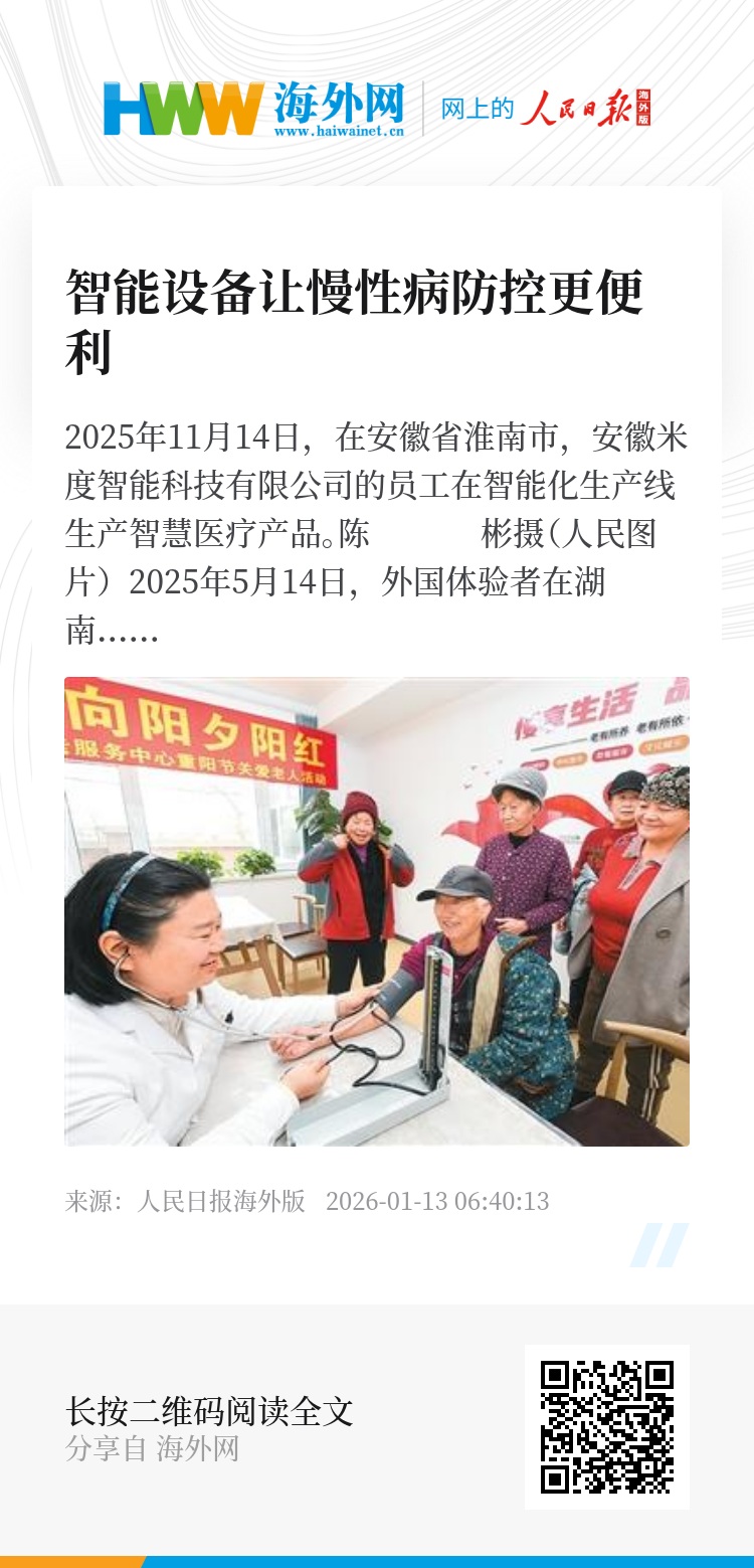 从贺兰山下的智慧门诊到黄海之滨的无人机送药,从动态血糖仪的普及到AI审方系统的全覆盖,智能设备正以多元形态融入慢性病防控各环节。随着技术迭代与体系完善,慢性病防控正从“碎片化管理”向“全周期服务”,向“全民共享”加速迈进。智能设备正在让慢性病防控更便利,让越来越多的慢性病患者实现“在家监测、精准管理、便捷就医”。(本报记者 杨俊峰)