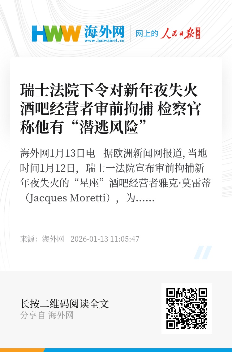 海外网1月13日电 据欧洲新闻网报道,当地时间1月12日,瑞士一法院宣布审前拘捕新年夜失火的“星座”酒吧经营者雅克·莫雷蒂(Jacques Moretti),为期3个月。法院表示已对此案件展开刑事调查。
