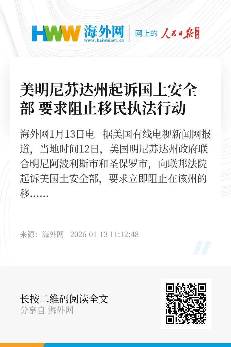 海外网1月13日电 据美国有线电视新闻网报道,当地时间12日,美国明尼苏达州政府联合明尼阿波利斯市和圣保罗市,向联邦法院起诉美国土安全部,要求立即阻止在该州的移民执法行动。