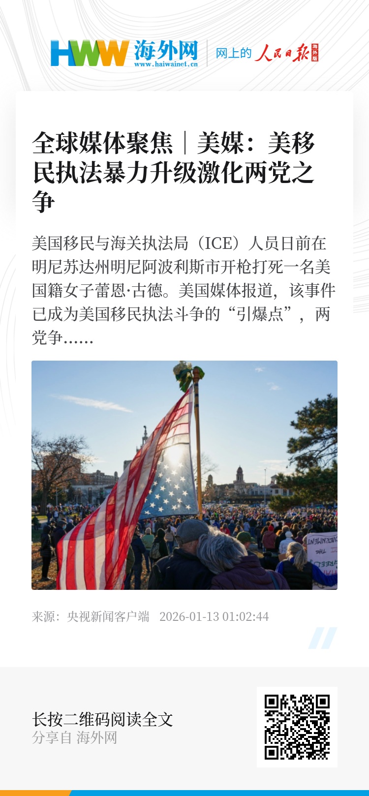 美国《政治报》网站11日的报道称,明尼阿波利斯女子被枪杀的事件成为全美移民执法斗争中的引爆点。地方和联邦政府之间分歧明显,相互指责对方加剧了全国的紧张局势。明尼阿波利斯的官员坚称,联邦政府官员在妖魔化移民和抗议者,导致暴力不可避免地升级。