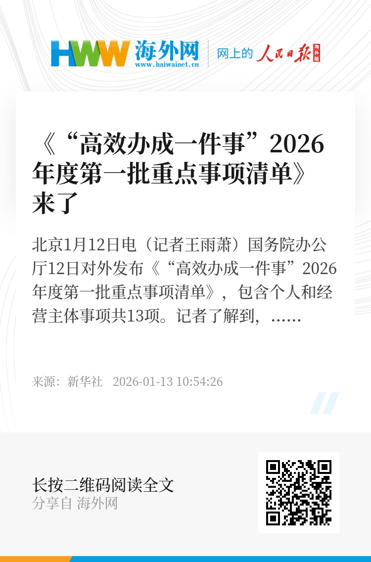 新华社北京1月12日电(记者王雨萧)国务院办公厅12日对外发布《“高效办成一件事”2026年度第一批重点事项清单》,包含个人和经营主体事项共13项。