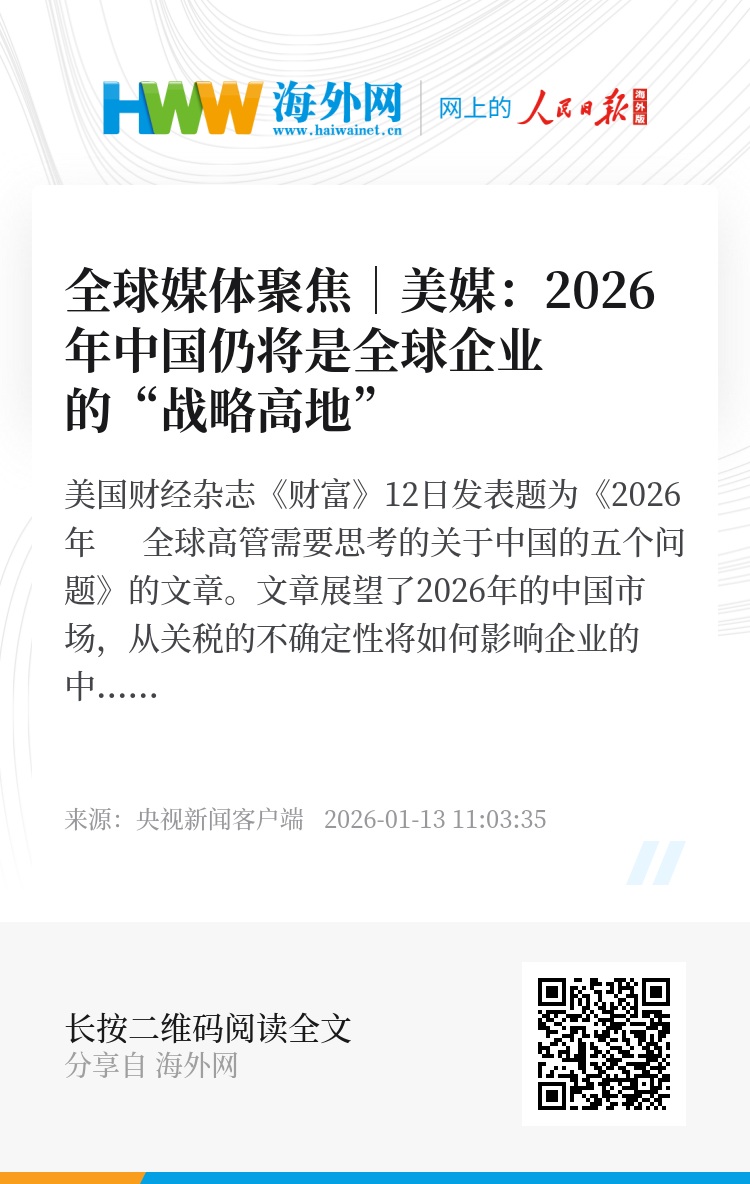 美国财经杂志《财富》12日发表题为《2026年 全球高管需要思考的关于中国的五个问题》的文章。文章展望了2026年的中国市场,从关税的不确定性将如何影响企业的中国战略、中国消费转向何处、如何在高度竞争的中国市场中脱颖而出、中国AI将如何重塑生产力等五个方面为全球企业高管的中国战略提供了思路。