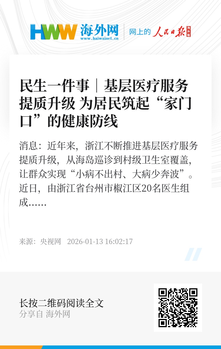 央视网消息:近年来,浙江不断推进基层医疗服务提质升级,从海岛巡诊到村级卫生室覆盖,让群众实现“小病不出村、大病少奔波”。