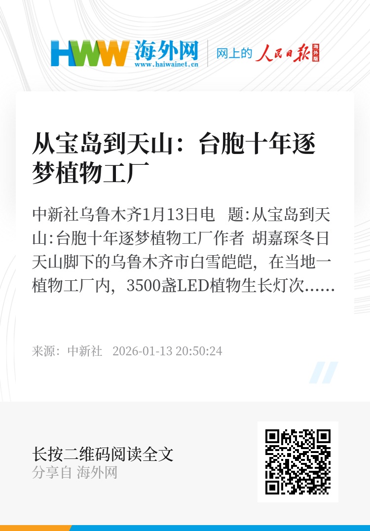 中新社乌鲁木齐1月13日电 题:从宝岛到天山:台胞十年逐梦植物工厂