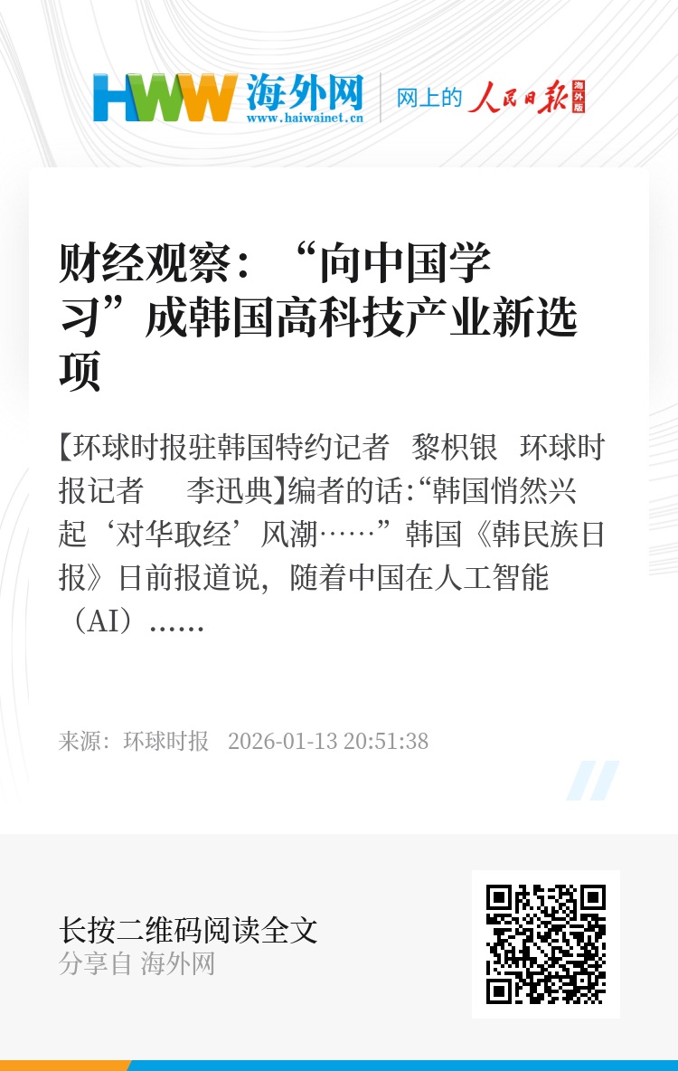 上海外国语大学世界智库研究中心人工智能项目负责人张志鹏接受《环球时报》记者采访时表示,2020年之后,随着人工智能大模型进入爆发期,韩国产业界及学术界对中国科技发展的态度发生了快速转变。韩国不仅希望学习中国的高端技术,还致力于借鉴中国一整套高端产业发展策略,包括政策支持模式、产学研一体化生态的构建及快速落地机制,并主动推动韩国本土高端企业在国内及东亚、东南亚地区搭建新的经济和创新生态系统。