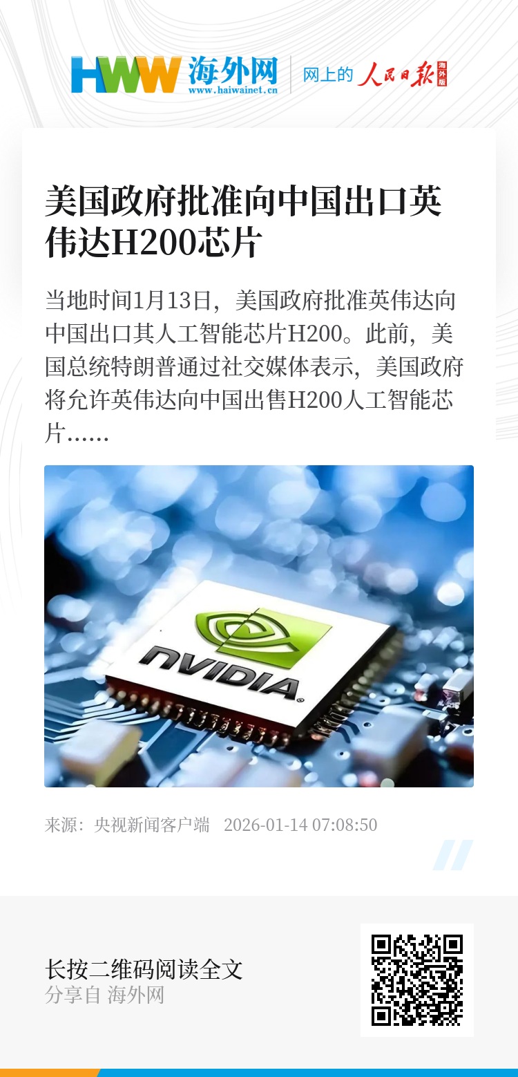 当地时间1月13日,美国政府批准英伟达向中国出口其人工智能芯片H200。