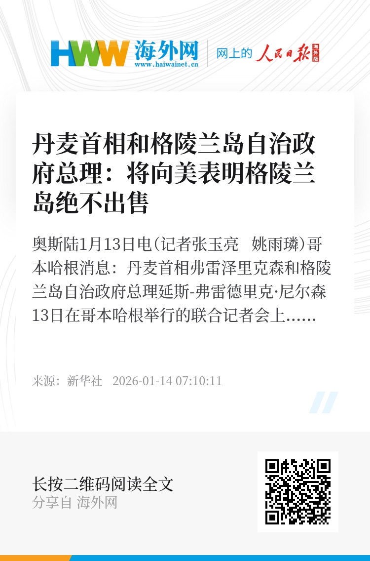 新华社奥斯陆1月13日电(记者张玉亮 姚雨璘)哥本哈根消息:丹麦首相弗雷泽里克森和格陵兰岛自治政府总理延斯-弗雷德里克·尼尔森13日在哥本哈根举行的联合记者会上表示,丹麦和格陵兰岛方面将在14日于美国华盛顿举行的会谈中,向美方表达格陵兰岛绝不出售的决心。