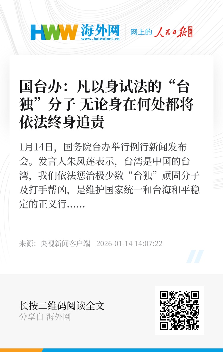 发言人朱凤莲表示,台湾是中国的台湾,我们依法惩治极少数“台独”顽固分子及打手帮凶,是维护国家统一和台海和平稳定的正义行动,是守护中华民族共同家园、保障台湾同胞切身利益福祉的正义之举。凡是以身试法的“台独”分子,无论身在何处,我们都将采取一切必要的惩治措施,依法终身追责。(总台央视记者 朱若梦 黄惠馨)