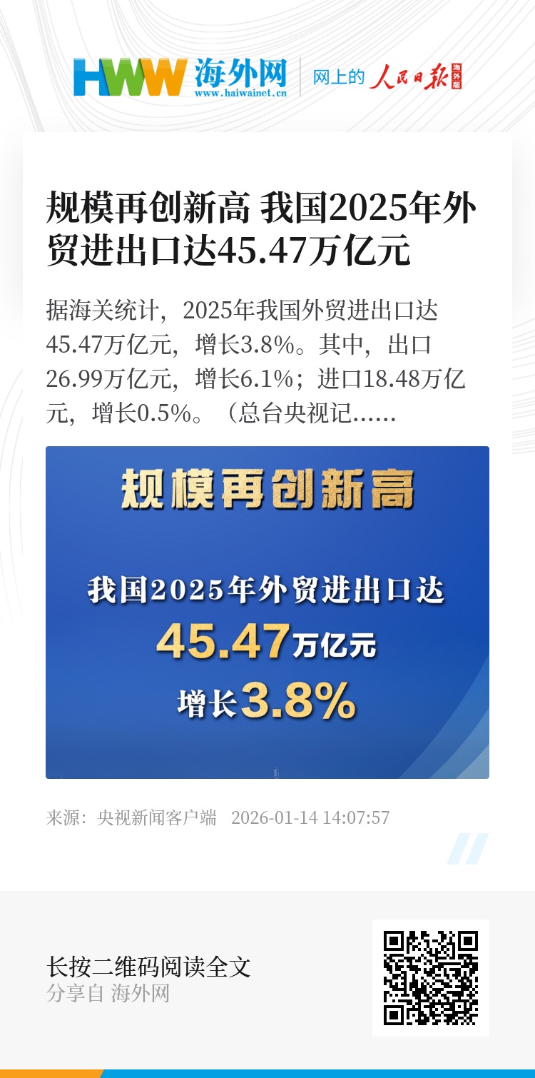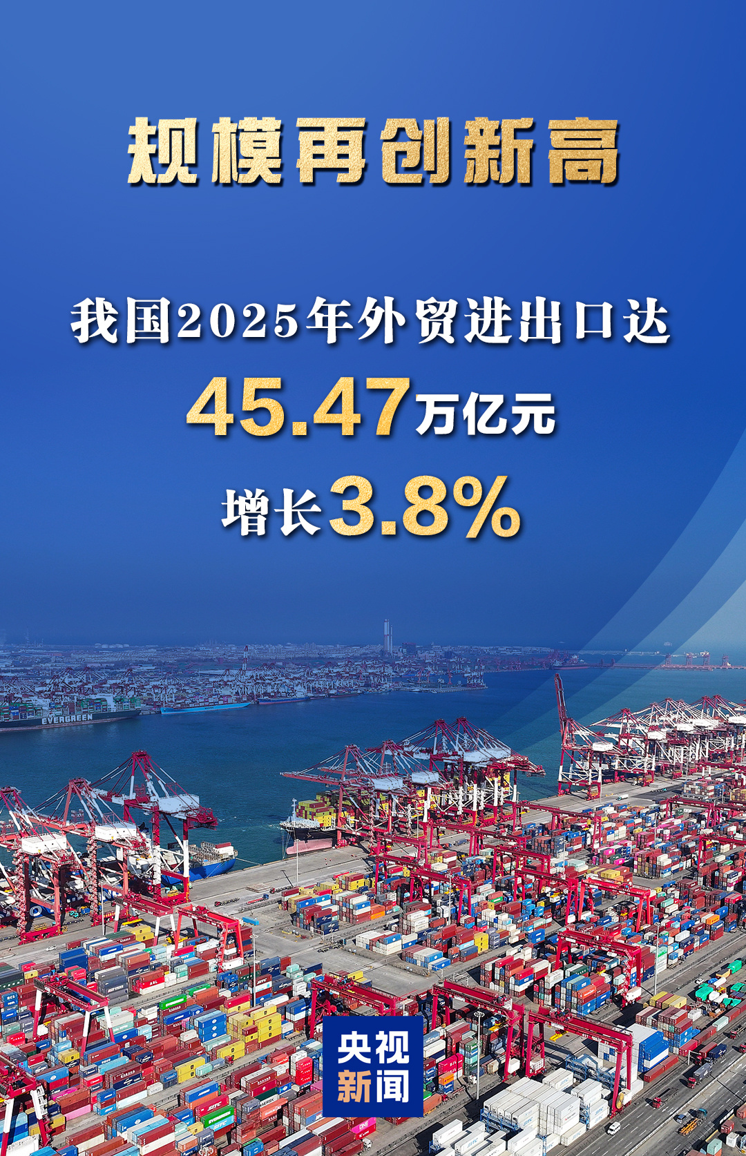 据海关统计,2025年我国外贸进出口达45.47万亿元,增长3.8%。其中,出口26.99万亿元,增长6.1%;进口18.48万亿元,增长0.5%。