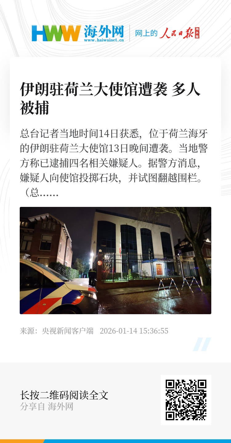 总台记者当地时间14日获悉,位于荷兰海牙的伊朗驻荷兰大使馆13日晚间遭袭。当地警方称已逮捕四名相关嫌疑人。