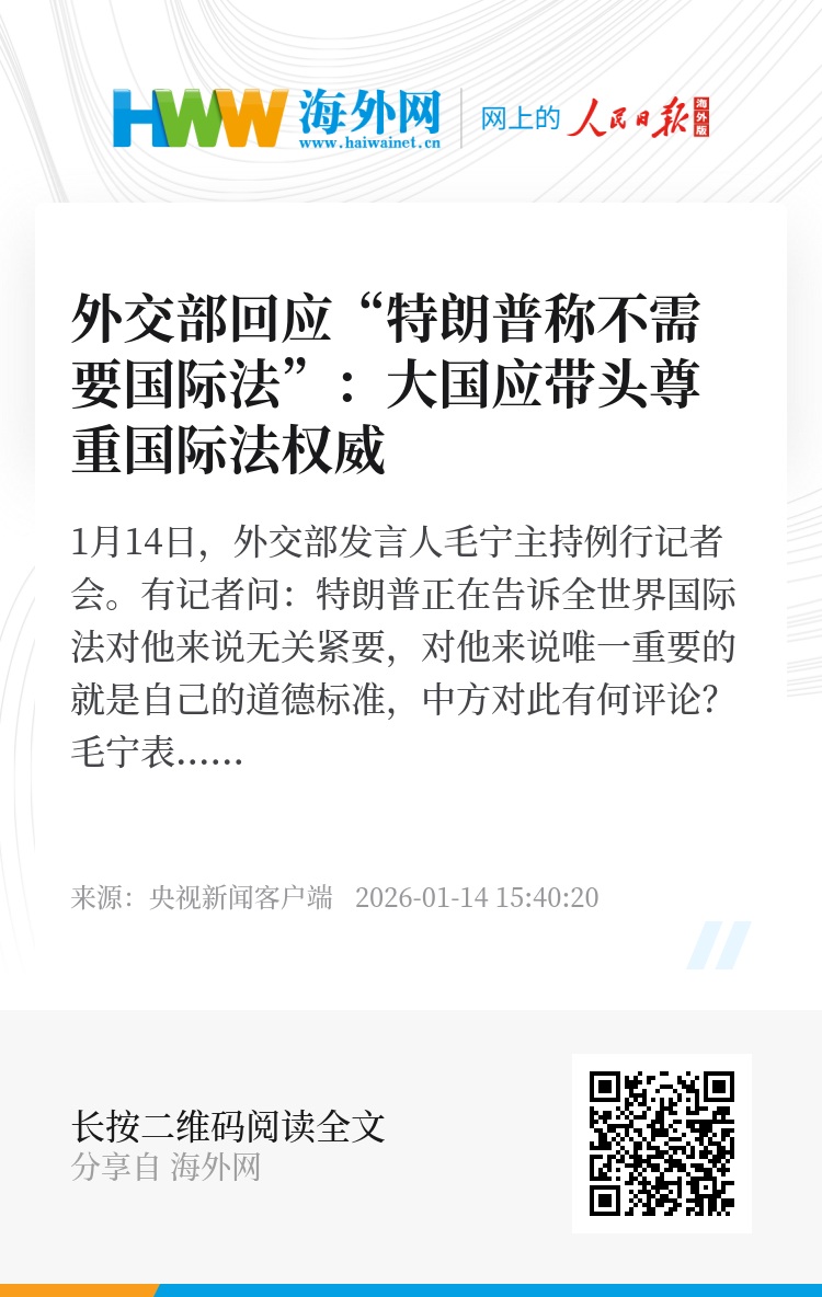 1月14日,外交部发言人毛宁主持例行记者会。有记者问:特朗普正在告诉全世界国际法对他来说无关紧要,对他来说唯一重要的就是自己的道德标准,中方对此有何评论?